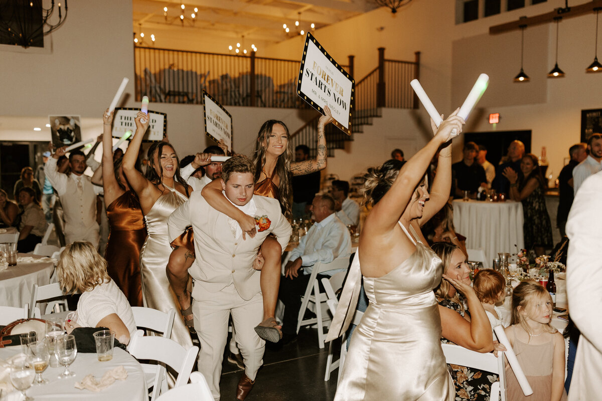 the bridal party grand entrance. while normally that is to welcome the couple into dinner this couple said "No, we want them to start the party!' The bridal party had fun signs and really brought the energy!
